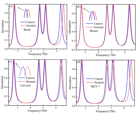 为了解决单纯利用金属材料设计的传感器灵敏度难达到太赫兹波段的难题,课题组充分挖掘石墨烯等材料在太赫兹波段的独特电磁特性,设计了一款可调谐的石墨烯超材料太赫兹传感器,研究发现,在3.11THz、5.337THz、5.849THz和7.477THz四个吸收峰的吸收率分别达到了99.24% ,99.9% ,99.6% 和99.8% ,通过调节石墨烯费米能级可以动态调控谐振频率峰值,形成四波段吸收式太赫兹传感器,当被测物体厚度为3微米时,测量的灵敏度达到2.25THz/RIU,研究结论为癌细胞的检测提供依据。